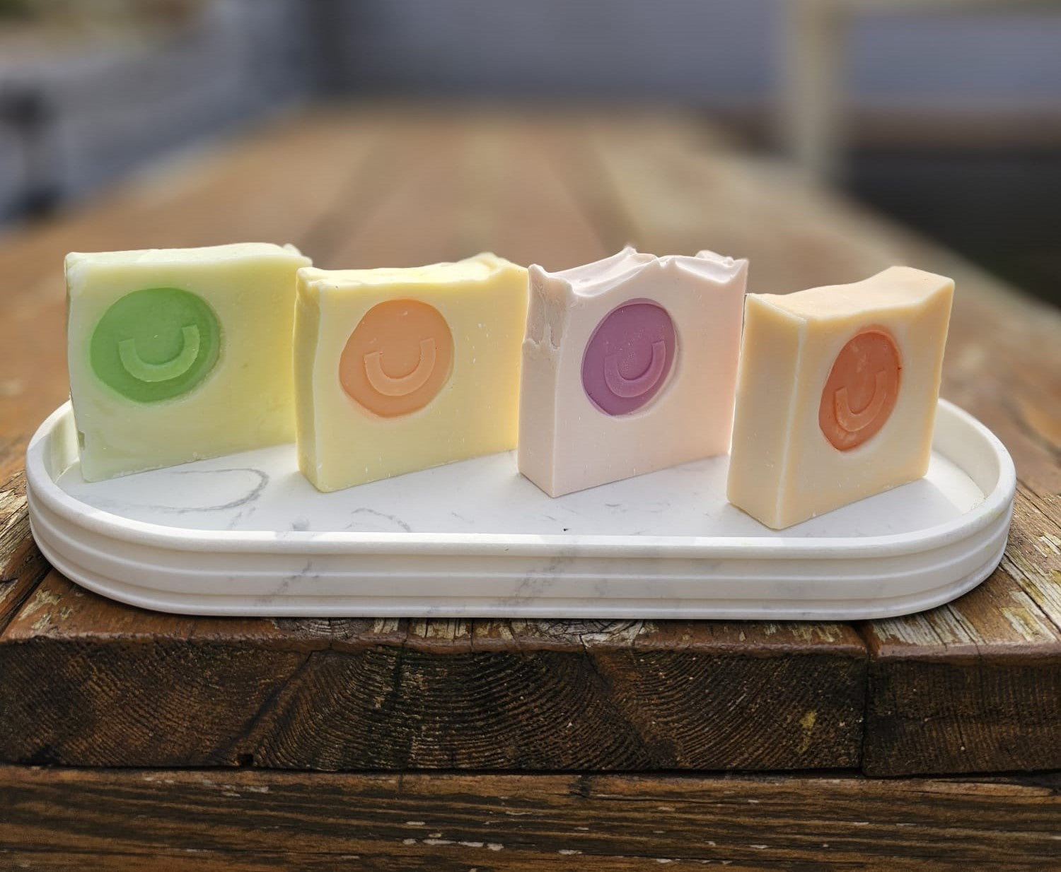 Each bar is hand stamped with a smile as we think you deserve skincare that brings you joy!.